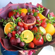 - фруктов. Мандарины, яблоки, виноград в различных сочетаниях станут прекрасным витаминным подарком. В композицию можно включить цветы. Самым изысканным фруктовым букетом считается клубника в шоколаде.